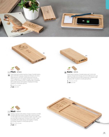 Power bank with wireless bamboo charger. Portable battery Power bank in bamboo. Portable battery with 5,000 mAh