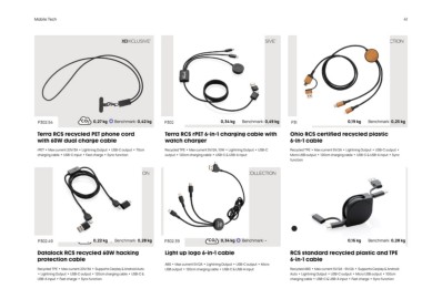 rPET • Max current 20V/3A • Lightning Output • USB-C output • 70cm Recycled TPE • Max current 5V/2A, 10W • Lightning Output • USB-C Recycled TPE • Max current 5V/2A • Lightning Output • USB-C output •