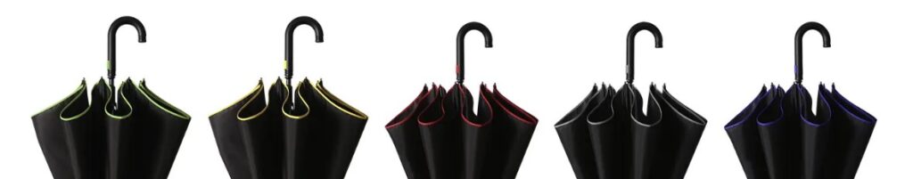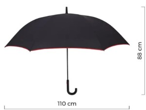 Opis: Kišobran sa 8 panela, u crnoj boji sa porubom u željenoj boji, gumirana drška, fiberglass mehanizam za otvaranje, plastični vrh, crni metalni krajevi i stub (Ø 10 mm)