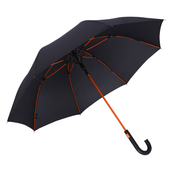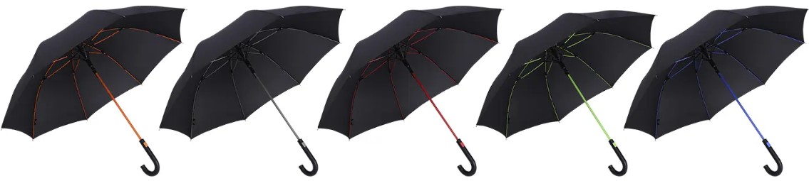 Opis: Kišobran sa 8 panela, osnovne crne boje sa ramom i stubom u boji, gumirana drška, fiberglass mehanizam za otvaranje, plastični vrh, crni metalni krajevi i stub (Ø 10 mm)